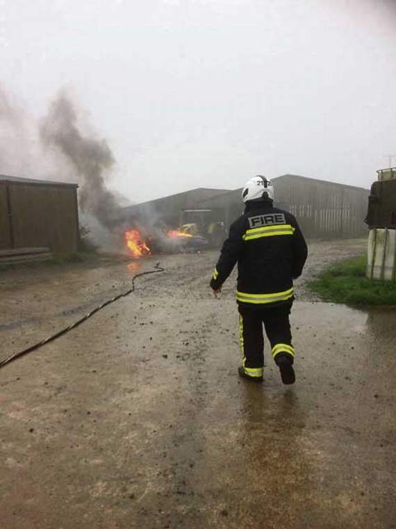 The vehicle, which was well alight on crews’ arrival at around 1.20pm, had been removed from a farm building, where it caught fire.