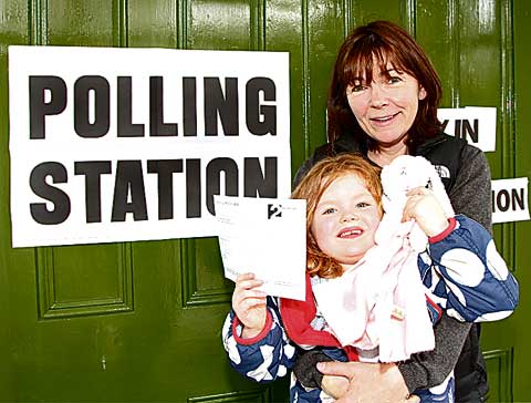 YOUNG VOTER! I'm Not Too Young To Vote! says Molly Stanford, holding her Mum Sophie's Poll card, and her rabbit 'Diddles' outside the Polling Station at the Church Hall, St Teath, on Thursday.