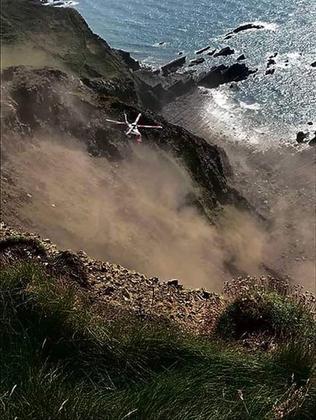 With Rescue 924 informed of the casualty’s status, and as it arrived on scene, the Edge Safety Officer set about guiding the helicopter on to the casualty’s position which was on a steep and precarious scree slope, part way down the cliff face.