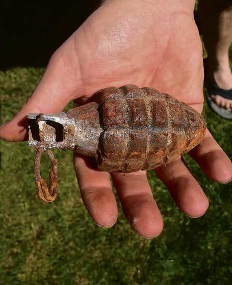 THE recently opened St Breward world war one exhibition almost became dangerously alive as a rusty pineapple hand grenade, dating from the war, with pin in place was found in a nearby garage. The young family, including children with visiting friends, were asked to evacuate their recently purchased house at Rylands when the husband discovered the rusty hand grenade hidden in a box as he was clearing out the garage. The police arrived speedily and awaited a decision from Bomb Disposal in Wiltshire while they viewed photos of the grenade still in the garage. Luckily, with a declaration that the grenade was safe, the family was able to move back in a few hours later. For the full report, and a round up of the area news and sport, see this week's edition of the Post.