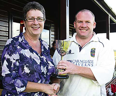 Werrington Cricket Club President, Linda Cobbledick, presents the runners-up trophy to St Neot captain, Spencer Ham last Saturday after his team had lost to Helston in the Division Two County play-off at Werrington.