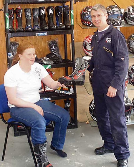 Devon Wheels 2 Work, based at Halwill Junction, recently took part in the Pirate Fm Radiothon, donating a pair of brand new bike boots to the auction. The winning bid was from Maureen Cooper who purchased the boots for her daughter Adrienne. Adrienne went in to collect her boots and was so thrilled with the ones she picked that she wanted to wear them home! They have a large range of boots and she chose a pair of Nitros in red. Max Jowett CEO of Devon Wheels 2 Work said: "We like to show our support to local charities because if it wasn't for local people we wouldn't be the success we are today." As well as a large range of clothing and accessories, they have a fully equipped workshop for service, repair and MOTs. Devon Wheels 2 Work is a not-for-profit Community Interest Company, which helps people from rural areas of Devon get to their work place or training centre by arranging the hire of a motor at a fraction of the normal cost.