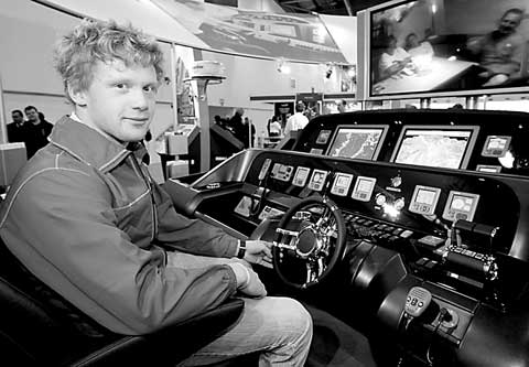 WILL Pepworth from Bude — the Raymarine Young Sailor of the Year regional winner (right) — tries out the Raymarine Sunseeker simulator at this year's London International Boat Show.