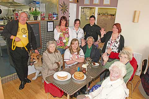 WAVES AND SMILES: Back row from left are Tony Powley with Rex, Nicky Green, Kim Bate, Jen Jones-Giles (cafe assistant) and Lisa O’Shea (St Hilary Manager). Sat in front are Ursula Wilde, Beth Foot, Muriel Tape, Nancy Mead and Eileen Taylor.