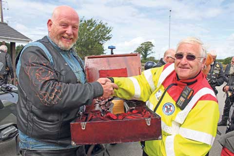 Steve Howard of the RBL Cornwall Riders branch receiving the wreath from Mo Ayling from the Devon Riders branch. Picture: Pictures: Paul Hamlyn