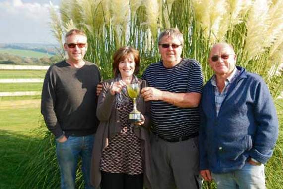 From left to right: Ashley Green, Monica Gelder presenting the Rodney Neale cup to Andrew Parrish and John Stacey.