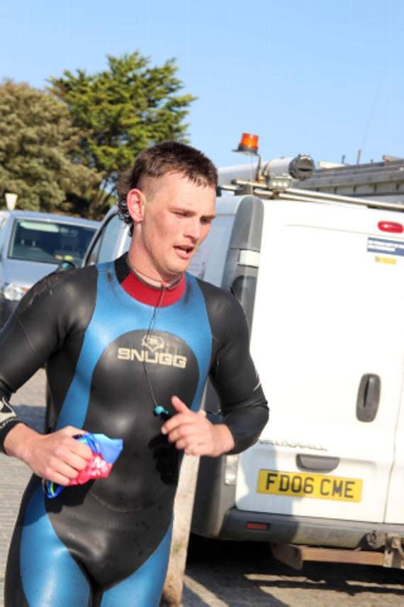 He was second out of the swim with Andy Virgin, of Poundstock, just in front. During the cycle leg the relay team cyclists dominated with Bude’s Chris Hammond producing the fastest cycle time ever and putting his team into the lead.