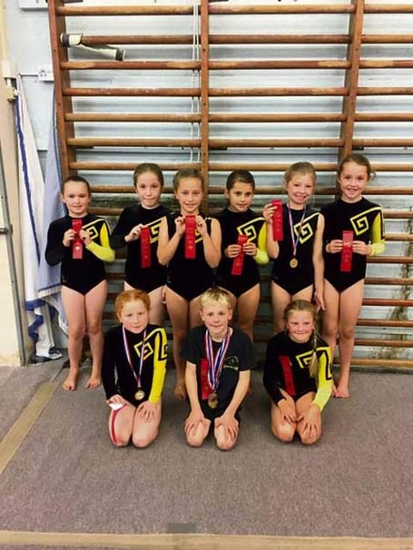 The under 13 girls put in outstanding performances on all ?ve pieces, coming away with a huge medal haul. In the Category One competition, Sophie Evans earned bronze medals on the vault and ?oor and silvers on beam, trampette and physical preparation to gain a well deserved silver medal placing overall.