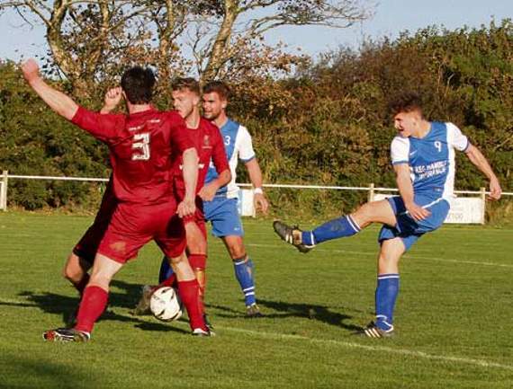Camelford were now in the ascendency, and the second came ten minutes later as Hopkinson’s free-kick pinned around the area before falling to Adam Sleep at the back post to smash the ball home.