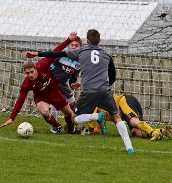 Against the run of play, Helston gained a first half advantage through top scorer Mark Goldsworthy whose scuffed shot found the back of the net after Launceston had trouble clearing from a corner.