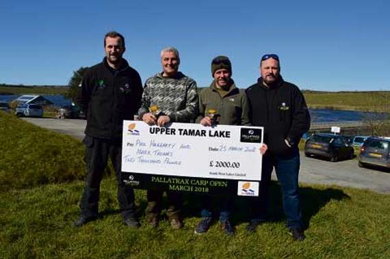 BUDE’s Phil Haggarty (second left) and Penzance’s Mark Thomas received a cheque for £2,000 after winning the Pallatrax Carp Open at Upper Tamar Lake on Sunday, March 25.