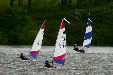 James Pollard crossed the line first with Adam Hilton, Vicki Duncalf, Nathan Pollard and Jane Anderson following. On the second lap James went the wrong side of a buoy and had to go back. On the third he capsized but recovered still without losing his lead. Jane Anderson after her unpromising start was catching Adam and took over second place when he realised he'd been going the wrong side of Pinkie each time and retired.