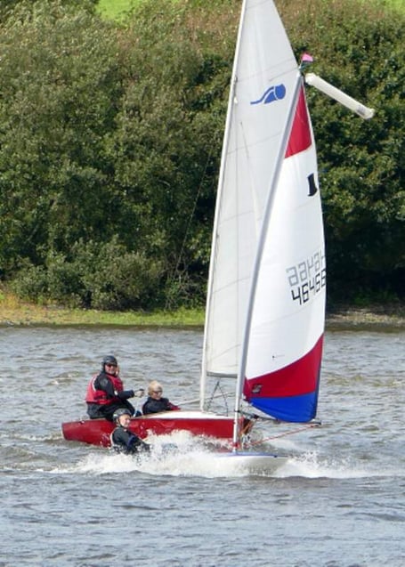 Jane Anderson again took on a Bosun challenge, this time with John Dabbs, Sally Wills and third crew member/bailer Robin Spiller. Close behind for two laps, her Topper was propelled past during an impressive plane down the lake on lap three.