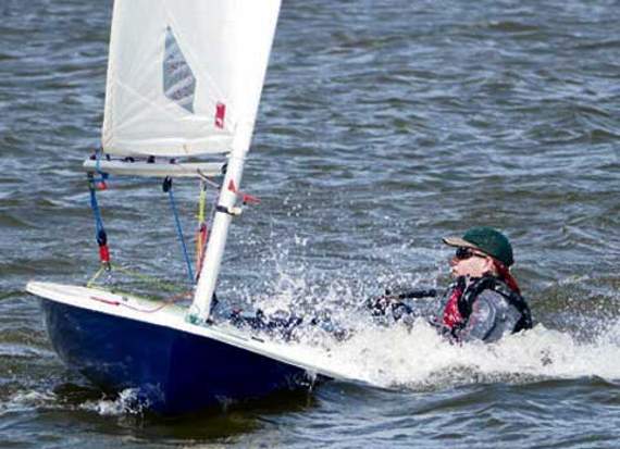 In the end, only four boats made it across the start line, with Nathan Pollard’s Topper being first away, but James Pollard’s Laser 4.7 was soon clear on its own, hurtling downwind at vast speeds in wildly fluctuating south-easterly winds. Sue Murray’s Laser 4.7 flipped over as it rounded the Dam Red buoy, but Sue showed impressive agility and determination in righting her dinghy and regaining control before she drifted in amongst the lines of the fishermen on the nearby bank.