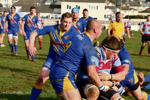 At 17-0 Truro looked comfortable, but Bude’s strong forwards, ably led by Chris Allin, Jason Bolt, James Comber and Dave Gregory, dragged Bude back into the game, eventually mauling their way across the line allowing replacement Matt Williams to force his way over.