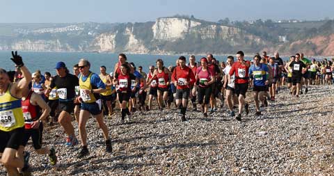 The course is an extreme one, with large sections of the 20 mile route being set on uphill paths and fields, incorporating a stepped climb known as the Stairway to Heaven — from the Pebble beach of Branscombe to the top of the sea cliffs overlooking Seaton Bay.