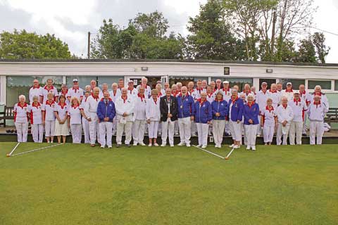 ABOVE, players from Bowls England and Dunheved Bowling Club who took part in the special centenary celebration event. Left, Bowls England President Adie Lloyd and Dunheved Bowling Club President Peter Prynne in action. Picture: Paul Hamlyn