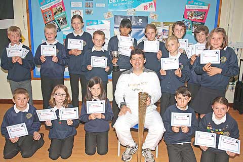 MADE WELCOME: The pupils of St Stephens County Primary School, Launceston were lucky to have an Olympic torch bearer visit on Wednesday, July 18. The torch was brought into school for a special assembly by parent Dave Green, who was nominated to run with the torch because of his charitable works. The pupils pictured with Dave and the torch are all members of the school's athletics team which competed in the Launceston primary schools athletics competition at Launceston College in June.