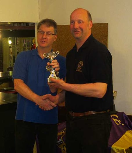 SKITTLES captain Paul Gould receives the runners-up trophy from the South-West District Governor-elect Alan Good.